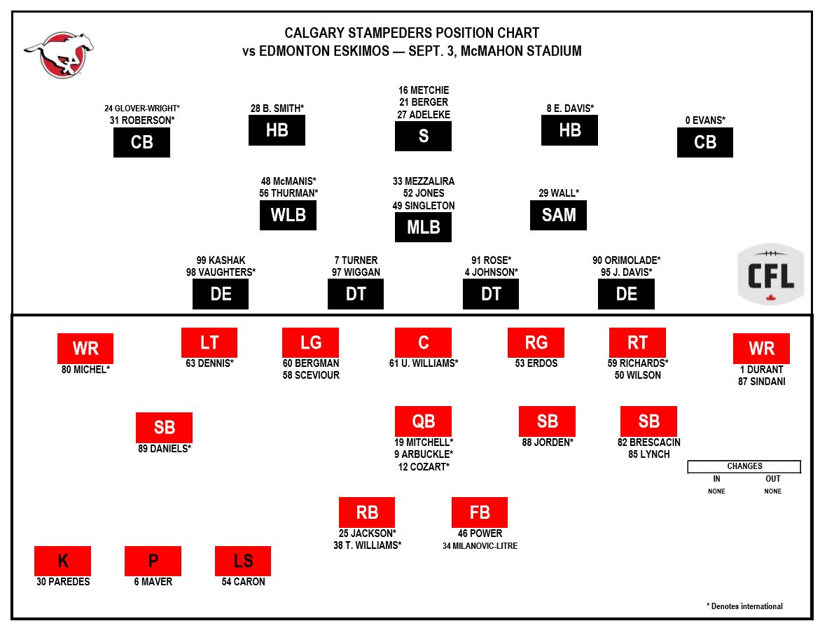No changes for the Stamps roster from last week - Position chart is below: