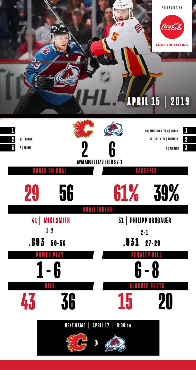 Calgary is still completely in control of this series. If they play they way we all know they can and did for most of the year Colorado doesn’t stand a chance.