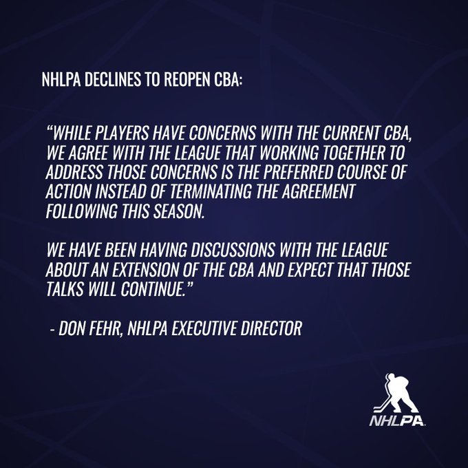 The #NHLPA announced today that the Executive Board has declined to reopen the CBA with the NHL following the 2019-20 season. The current CBA remains in effect through the 2021-22 season.