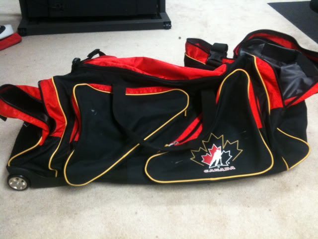 Adult Hockey Bag. Has wheels. Team Canada design. Used only a couple times. No dirt, no tears, doesnt smell. Has a couple small scuffs on the skate pockets, probably came from loading/unloading into the car.