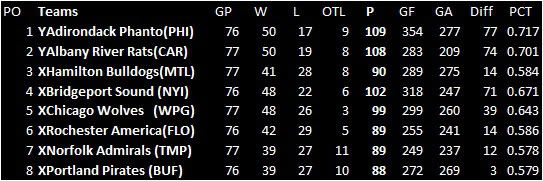 If anyone cares..still some jockeying for position with teams either having one or two games left due to the shortened 78 game season. Portland (BUF) could still move as high as 3rd. One series is set between Bridgeport and Chicago.