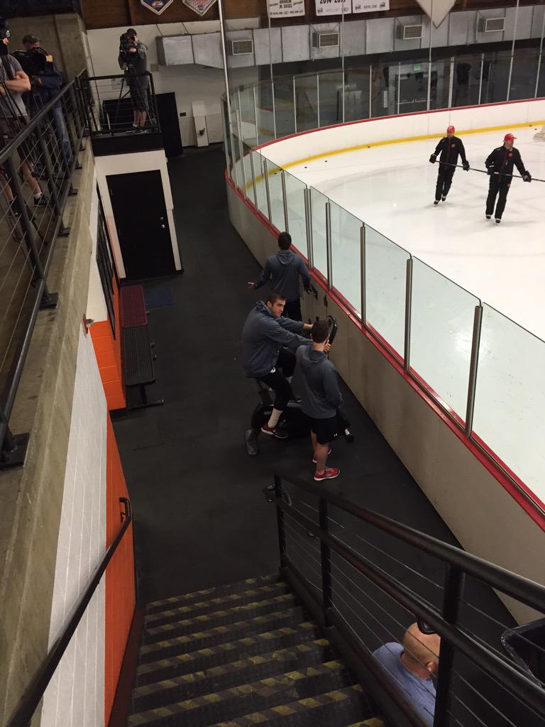Poolie alert: #Flames captain Mark Giordano and Brandon Bollig are blueline partners for penalty-killing drill in practice.