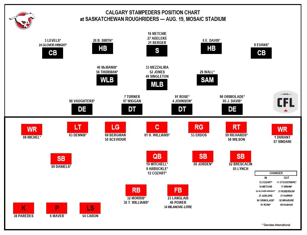 Week 10 wraps up with the Stamps taking on the Riders at New Mosaic Stadium - Still no Don Jackson for Calgary in the backfield, but Tunde Adeleke is back. Depth chart is below: