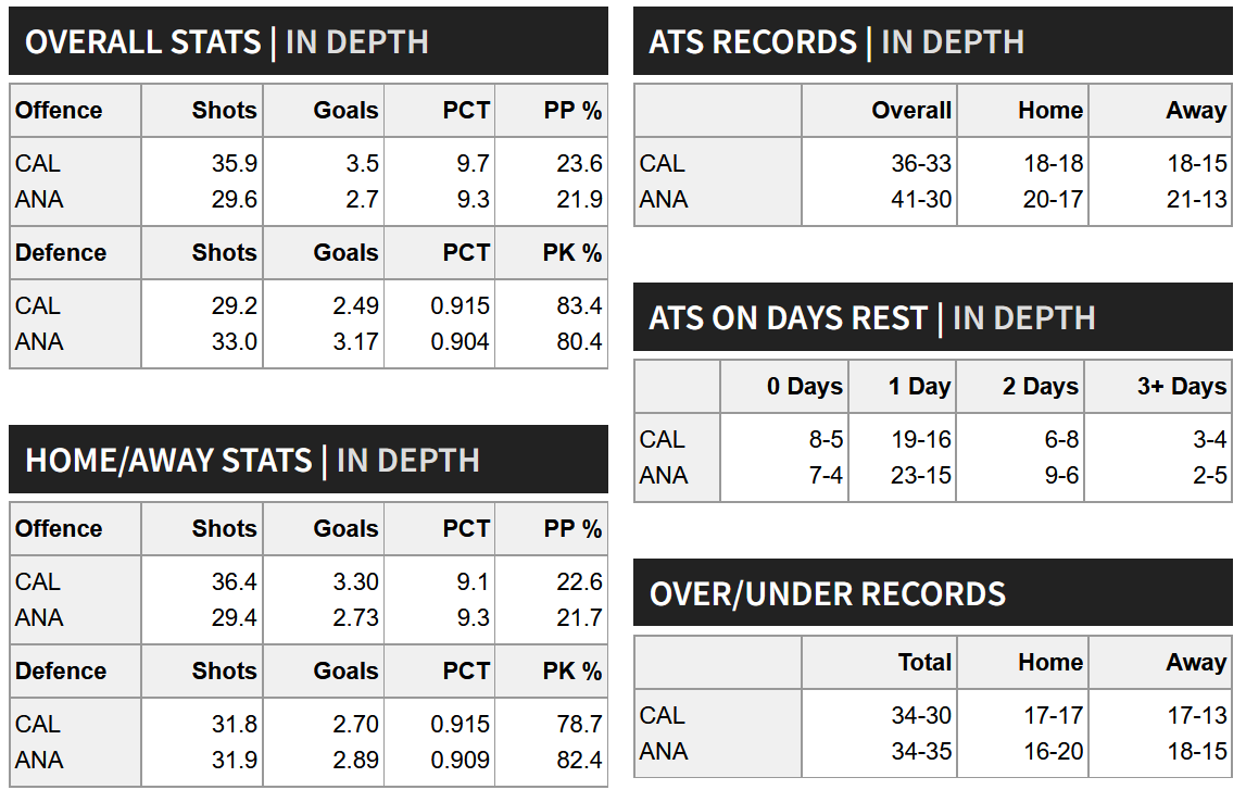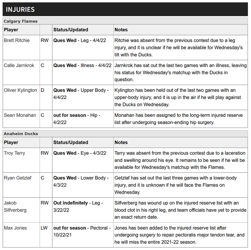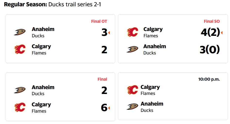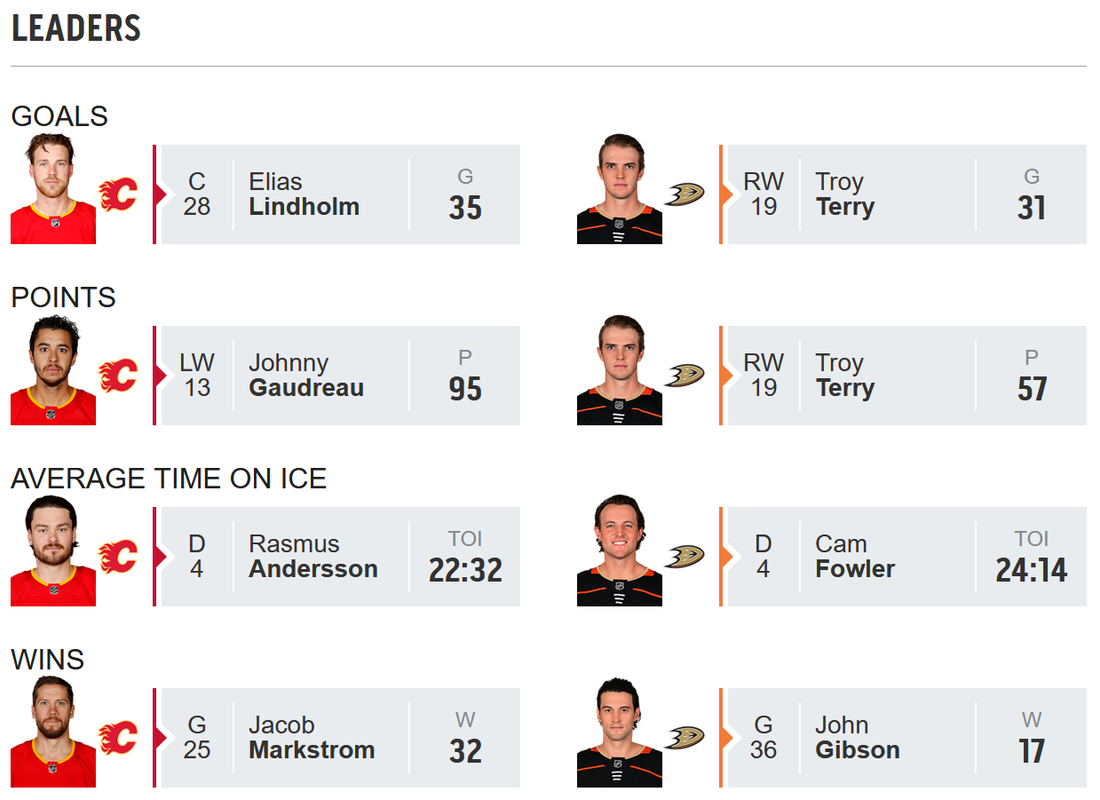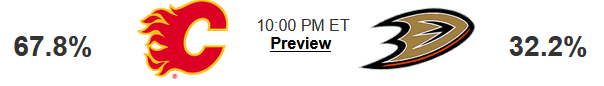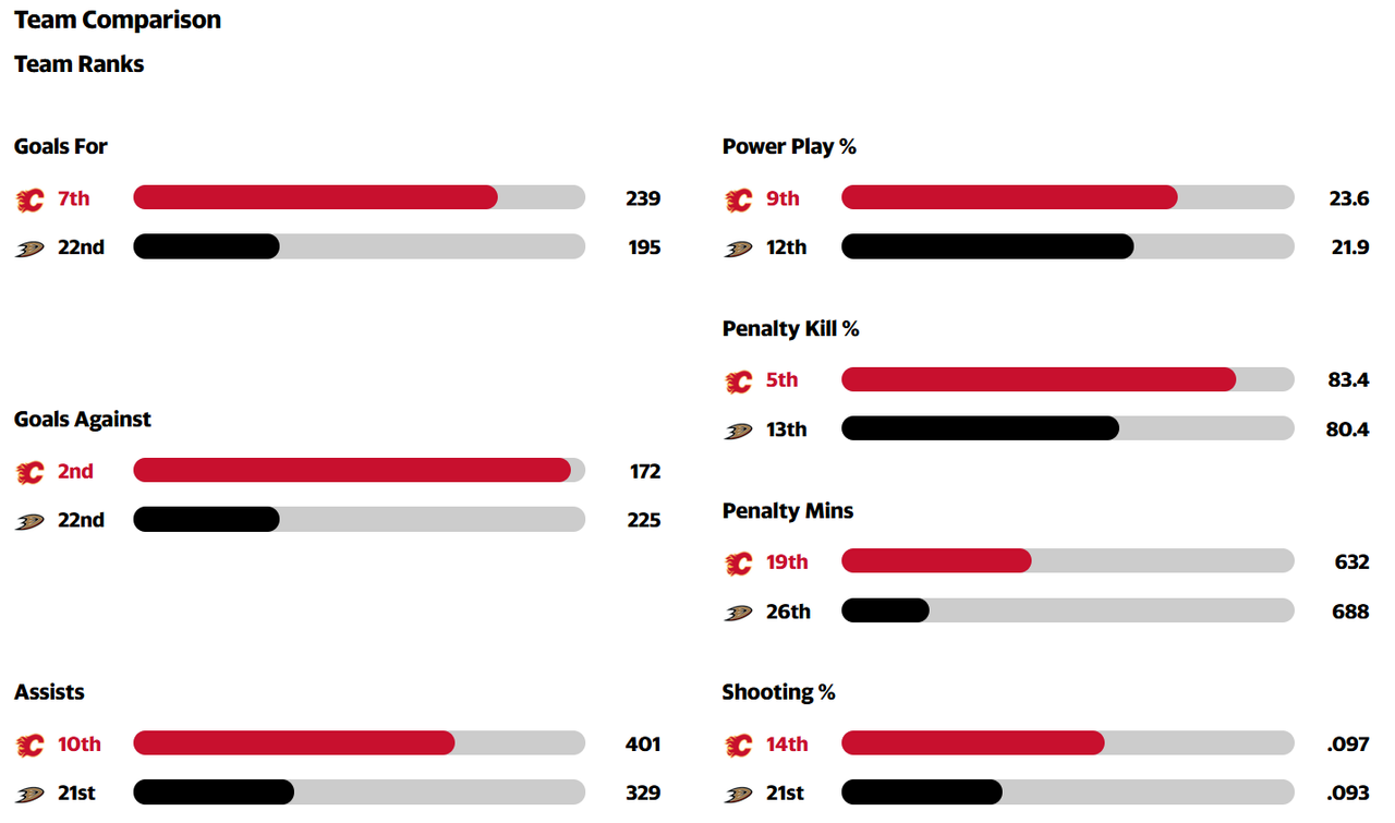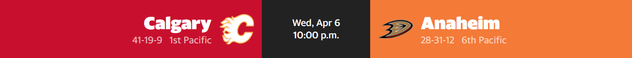 Next up for the Pacific Division-leading Flames (41-19-9, 91 points) is to take advantage of a favorable schedule, with their four-game trip heading down the road to face the struggling Anaheim Ducks (28-31-8, 68 points) on Wednesday.