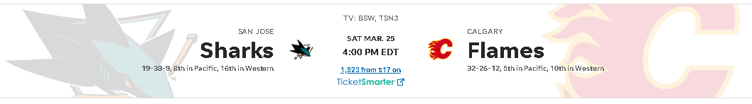 San Jose Sharks at Calgary Flames 2:00pm TV: SN, BSW - RADIO SN960