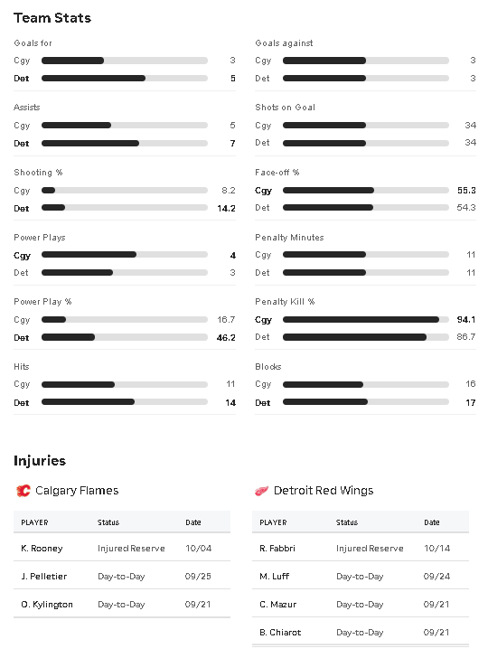 Time to battle as team through the adversity of losing your top PP defenceman. Good opportunity for Weegar and Hanafin to step up (I personally wouldn’t mind seeing Zadorov given a few reps). I hope the team gets up for this one and piles it on the Wings.