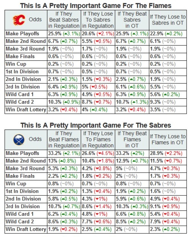 Flames goaltending is going to have to be on A game. Looks like buffalo has found their scoring touch. Sabres goaltending is a weakness though. Go flames!!!