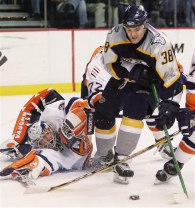 In their first meeting after the trade between the Isles and the Preds, Vokoun was all smiles until the game started. The new Preds completely dominated the Isles. Vokoun got yanked in the third and the Isles could only get eleven shots on net. Legace let one slip by him, playing in front of string defence in Jovonovski, Mclaren, Mitchell, Warrener.
