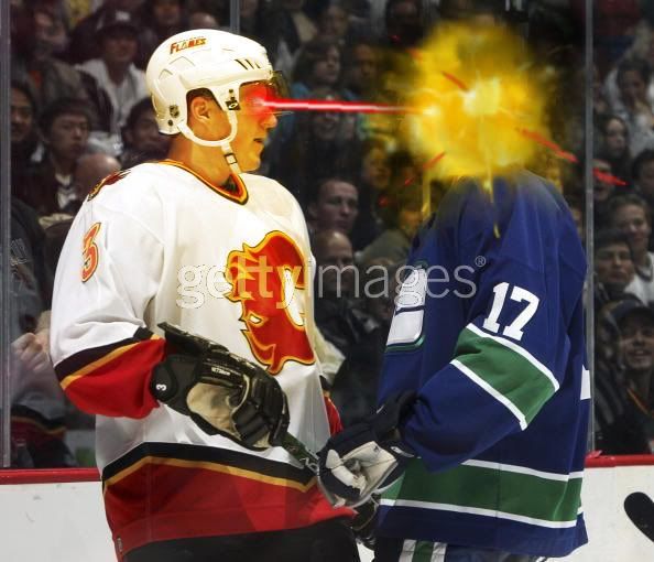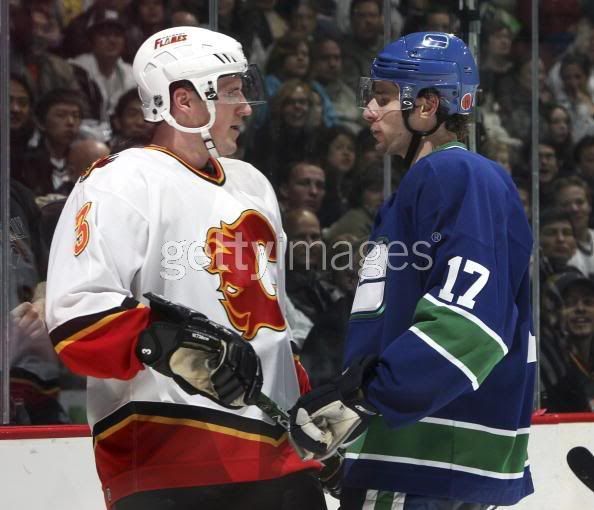 "Dion Phaneuf #3 of the Calgary Flames and Ryan Kesler #17 of the Vancouver Canucks exchange words on November 11, 2006 at General Motors Place in Vancouver, Canada. The Flames defeated the Canucks 3-2."