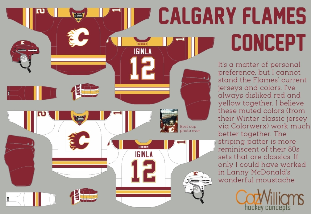 Alternate: I've never been a fan of black being included in the Flames' colour scheme, but I could live with it on a third jersey. I also have a soft spot for the 1990s 'pedestal' uniforms. Most fans associate that look with the futility of the Young Guns era, but those were the jerseys they wore when I first became a Flames fan and I think they would've been great sweaters if only they didn't include that stupid pedestal detail. I realize that many fans still love the black C jerseys from 2003-04 so my design for the third is a bit of a mashup between those two styles.