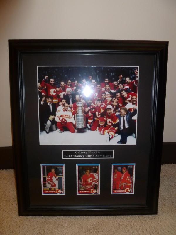 This is a professionally framed 8 by 10 photo of the Flames on ice celebration after winning the Cup. Also includes the 1988-89 hockey cards of Lanny McDonald, Al MacInnis and Joe Nieuwendyk. The frame itself measures 18 by 16 inches.