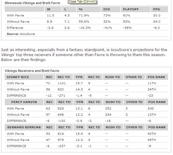 We’ve tapped into a number of statistical services in recent years, and two of them are offering us interesting takes on the impact of quarterback Brett Favre's career decision on the Minnesota Vikings. I’m not coming off my take that Favre will eventually return to Minnesota, but these numbers help explain exactly why there was so much hubbub about his plans.