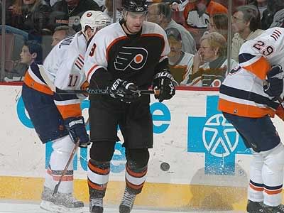 Pavel Brendl (left) battles Philadelphia's Kris Beech along the boards in