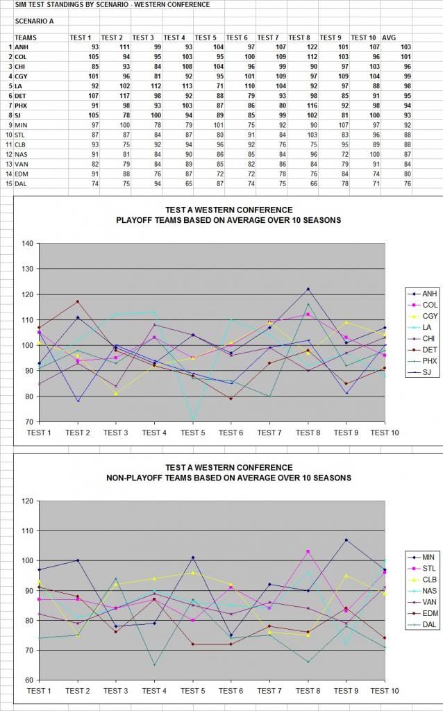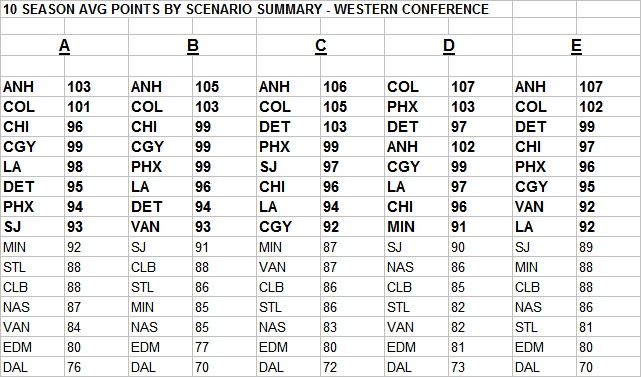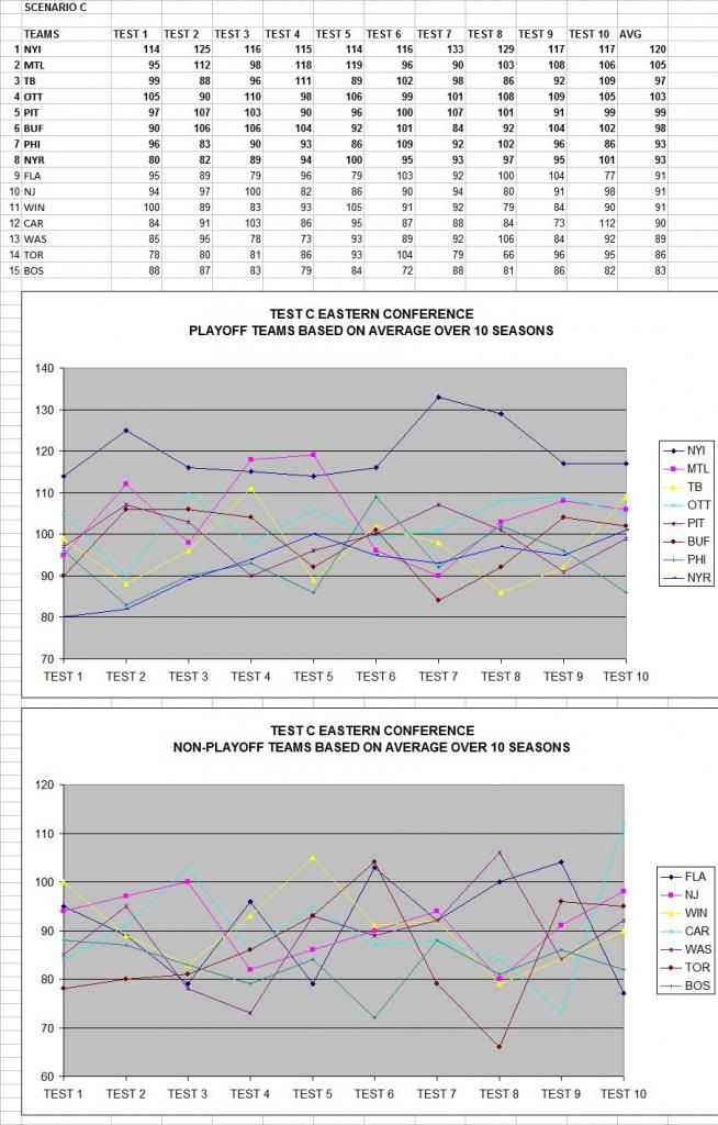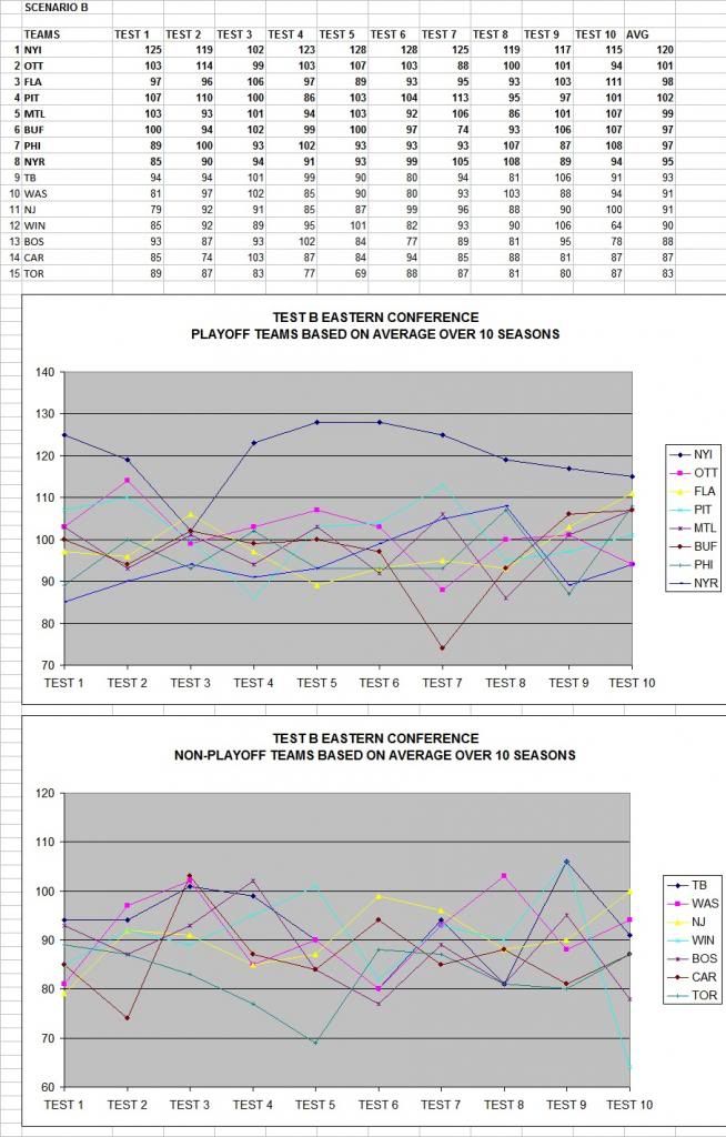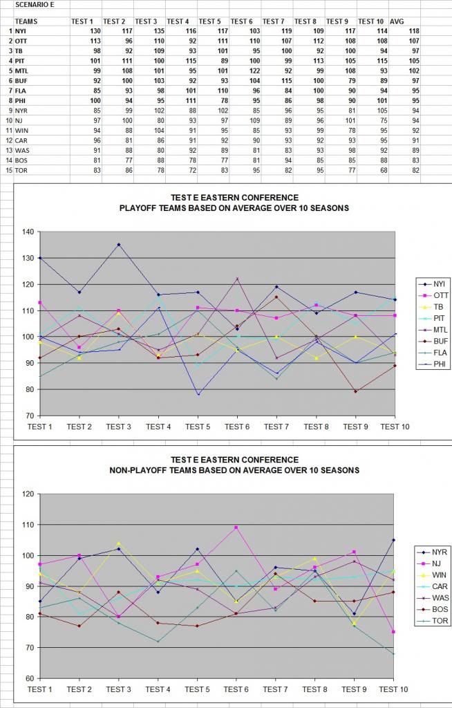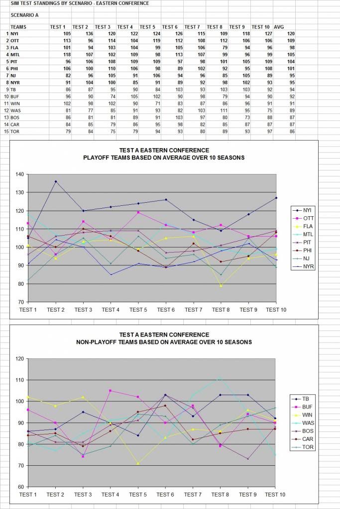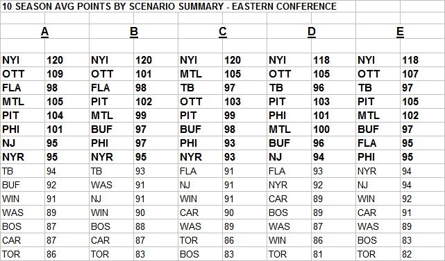 As far as standings go here is the average point totals over 10 seasons per scenario for the Eastern Conference. Will hopefully get to the Western Conference soon. I found that there was more variation between the seasons within the scenario than between the scenarios themselves (taking into account the average). Some teams had as high as 40 point variations between seasons within the same scenario and like Matt said finishing anywhere from 1st to last in their division. Things average out somewhat over many seasons. Again there is a ton of factors remaining constant and no one will ever know how much that effects the overall results. Nonetheless this is a very interesting exercise. NYI finished 1st in the East 39 out of 50 tests and finished below 4th once.