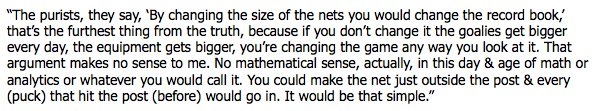 Changing the net sizes throws history on its ear. Just make the goalie equipment a little smaller and that is good enough.