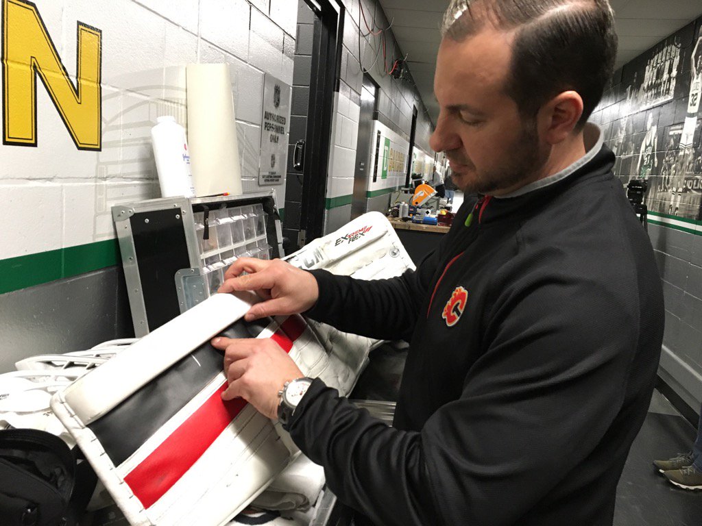 Mark DePasquale, the @NHLFlames equipment guru is converting Backstrom's pads from Minnesota Wild to Flames colours