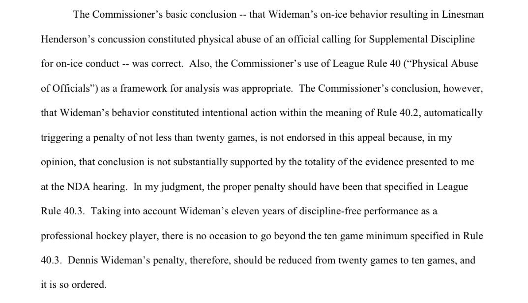 Hearing #Flames Wideman had his #NHL suspension reduced by 10 games by neutral arbitrator James Oldham today. @SNHockeyCentral