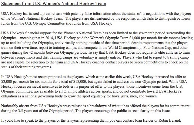 USA Hockey has offered terms to the Women’s National Team players for the Olympic training and performance period that include the opportunity to be provided with more than $90,000 in training stipends and other performance incentives for gold-medal performances in both the upcoming IIHF Women’s World Championship and the Olympic Winter Games. In the case of silver-medal performances in both events, players could receive $74,000 each. USA Hockey’s offer to the players is more than 50% greater than what they received in 2014. These figures do not include other substantial expenditures by USA Hockey for housing stipends, travel allowances, meal expenses, medical and disability insurance and the infrastructure that includes elite level support staff to train and prepare the players.