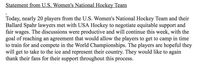 I'm not sitting here and callously saying we'll they shouldn't get paid for dedicating their lives to it. However Woman's hockey doesn't make a lot of money, not a lot of companies are rolling in to sponsor it in the USA, and until that changes then the players are going to realize that there's just not the money to give them a super confortable life while playing.