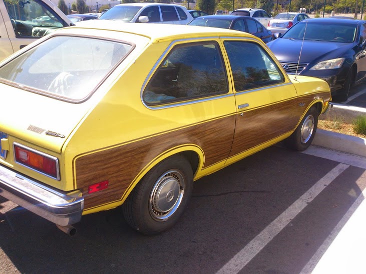 Here's mine, 1976 Chevrolet Chevette Woody, yellow just like this one. A hand me down from my parents. I found out why when I got the repair bills.  All it's missing are the white stripe tires to complete the car. When you filled it with gas and some spilled, the wood stuff peeled off. It went 65mph if you floored it. Edit: And a roof rack. Mine had a roof rack!