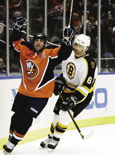 After Robert Nilsson and Kyle Wellwood put the Islanders up 2-0, the Bruins evened the game thanks to markers from Pavol Demitra and Alexander Mogilny in the second period.