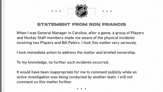Elliot Friedman had a piece where Ron Francis in essence called the former owner of the Hurricane's a full blown liar. The former owner made the claim he would have fired Peter's in a second given the allegations. Francis says that was a lie and he was made aware.