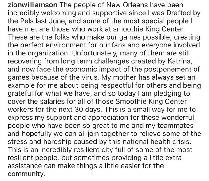 I can't even believe that players are having to step up in the first place. The owners of these franchises have the cash to pay these people. I don't follow a ton of basketball, but that Zion Williamson is a rookie who clearly doesn't have as much money as they owners, and he steps up to do the right thing? Good on him and all, but that's just ridiculous.