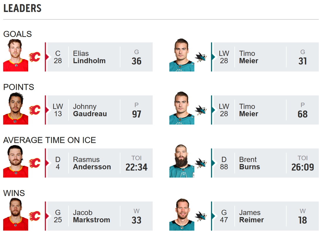 BOTTOM LINE: Johnny Gaudreau and Calgary square off against San Jose. He currently ranks fourth in the in the NHL with 96 points, scoring 34 goals and recording 62 assists.