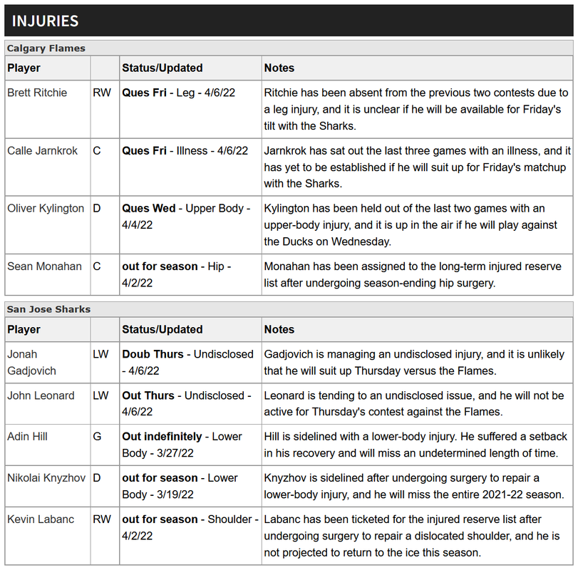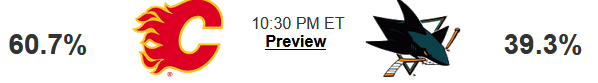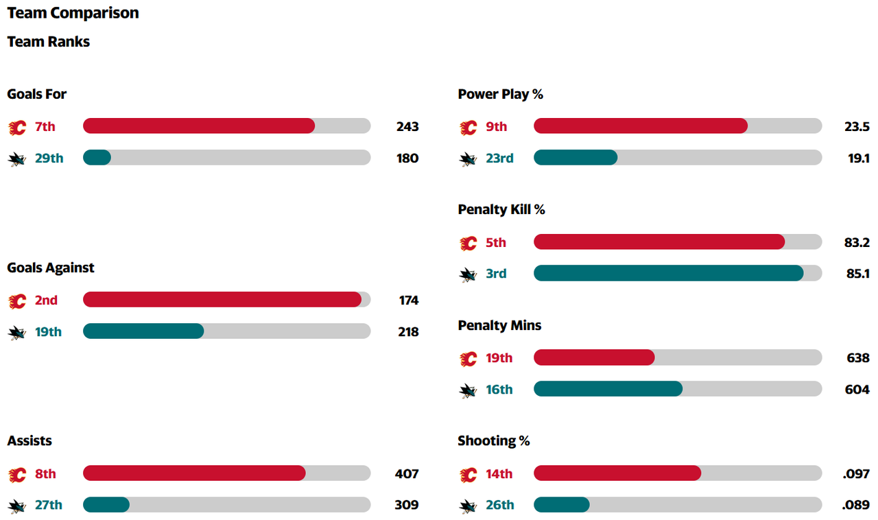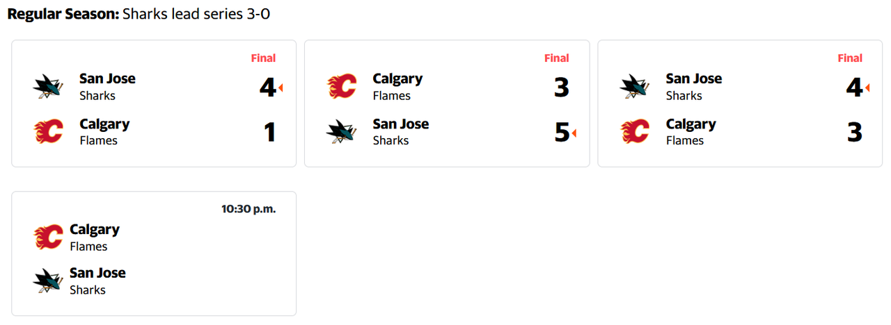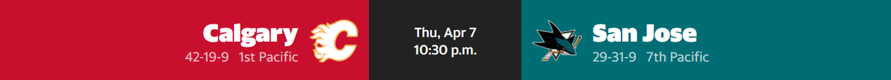 Flames have deserved much better against San Jose this year, it is hard to believe the Sharks can steal another win. The Flames game seems to be trending in the right direction, hopefully they build on two solid efforts in SoCal and get the terrible version of the Sharks that played the Oilers the other night.