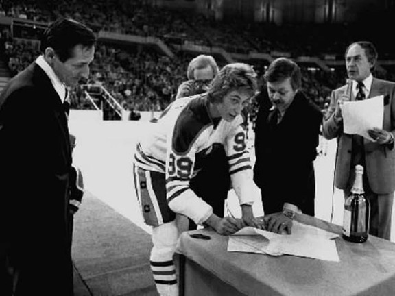 Maybe a bottle of champagne on a table like when they had Wayne sign a contract at centre ice pre game, back in 1979.