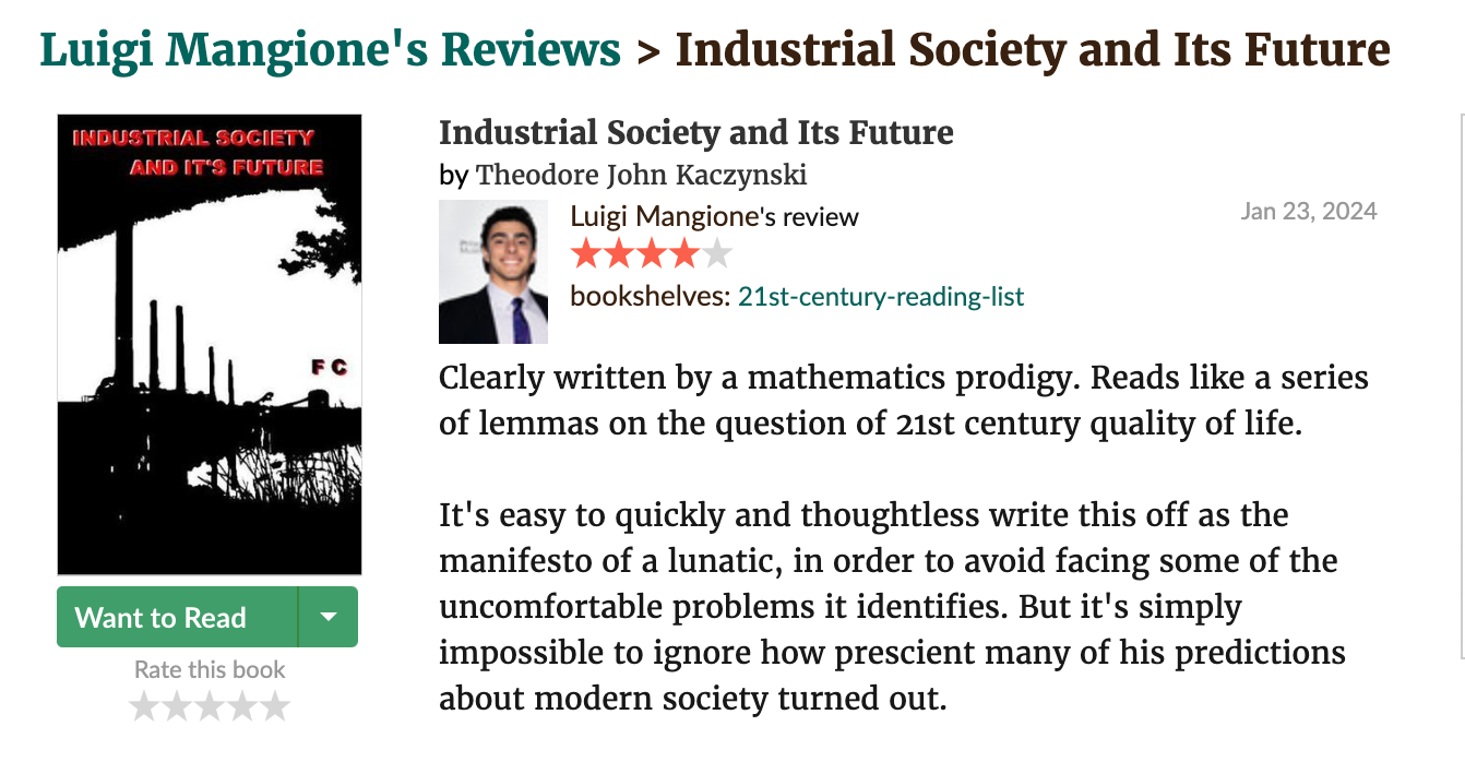 “He was a violent individual — rightfully imprisoned — who maimed innocent people. While these actions tend to be characterized as those of a crazy luddite, however, they are more accurately seen as those of an extreme political revolutionary,” the review by an account under Mangione’s name continues.