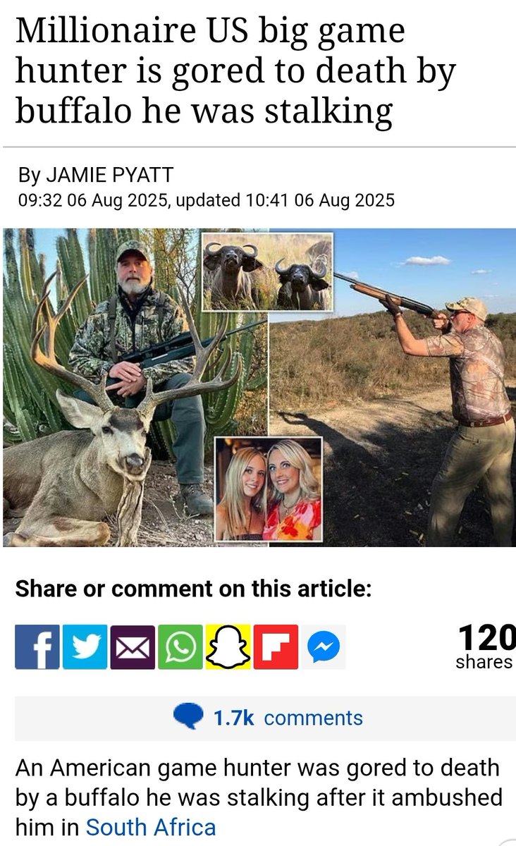 For real though, I am not even a very anti-game hunting type of fella, but IMO if you are hunting something and it kills you, that's just fair game, circle of life stuff. I don't feel bad for him at all.