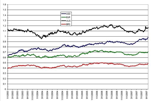 Here is a quick comparison of the Canadian Dollar vs the USD, EUR, BPD, and the Aust Dollar. Has done pretty good vs all of them over the last 4 years.