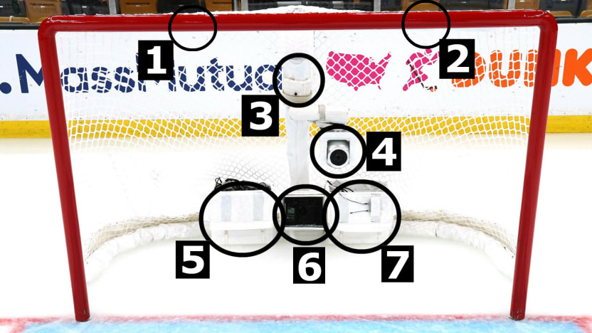 1, 2: NHL cameras embedded in crossbar, aimed at goal line; 3: NHL fixed camera aimed at goal line; 4. 360-degree TV camera; 5: Padded bag containing NHL camera transmission system and batteries; 6: Canon camera with 15mm fish-eye lens for still photos; 7: Padded bag containing high-definition super-slow-motion two-stream TV transmission system and batteries.