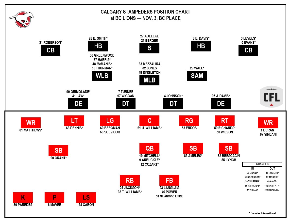 Bakari Grant in for Eric Rogers this week and Tre Roberson returns from injury. Stamps position chart is below: