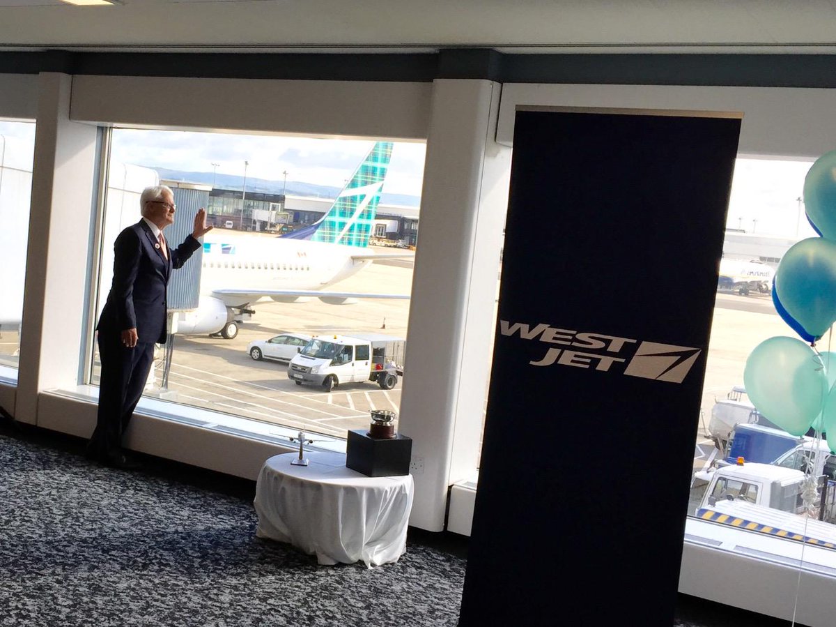 WestJet CEO Gregg Saretsky addressing the crowd; I was tempted to yell "Down in Front!" to Nova Scotia Premier Stephen MacNeil who is about nine foot twenty one.