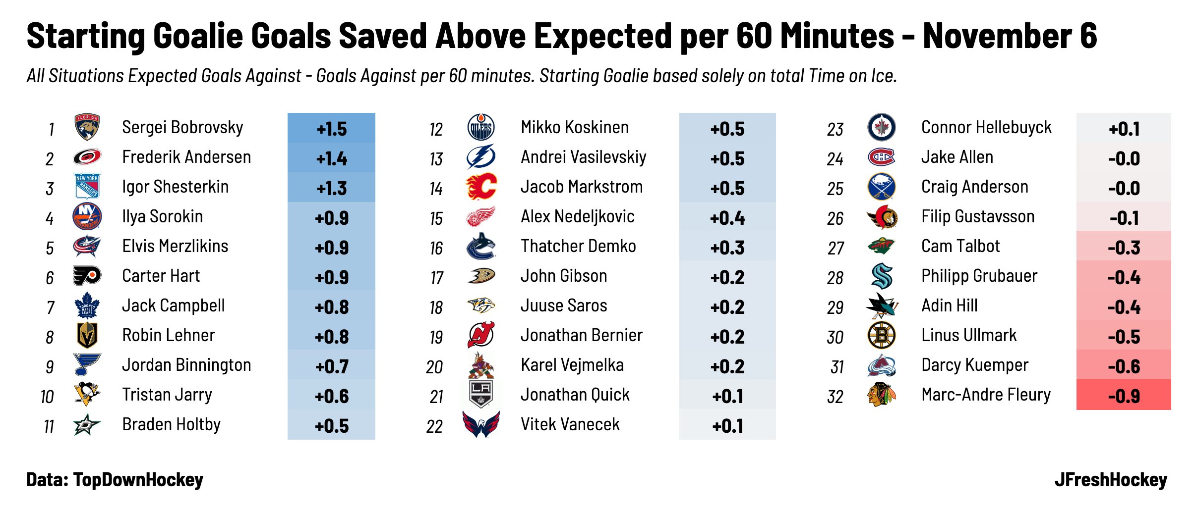 His workload has been so light, in fact that he's dropped well out of the top-10 in goals saved above expected since Halloween, despite posting that shutout against the Rags.