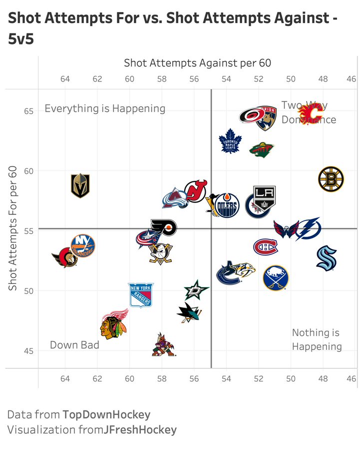 Now give me a goalie with 30 starts, and exclude all OT events from the calculations of QS%, and I think you might have something. But half of Markstrom's games (and all of his losses) have been either OT games or that Oilers game that was played under rare, bizarre, inequitable circumstances, so I don't believe that we have a representative sample at this point as far as that stat is concerned.