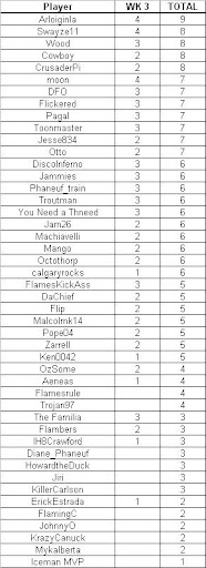 A good week for most of us after 3 blow out games. Congrats to those who got all 4 games right.