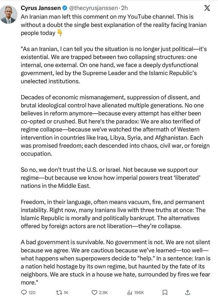 Yes one can certainly understand the views of that gentleman. But there are 30,000 innocent deaths at the hands of the regime in January alone that prove that “a bad government is not survivable”. This was one of the worst governments in the history of the modern world and their demise is to be celebrated.
