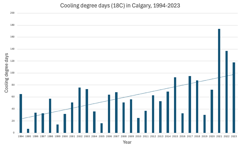 In the course of compiling this report I did my own analysis of the cooling degree-days (CDD) in Calgary, which that chart above graphs going back to 1994. Cooling degree-days are defined (in Canada) as the difference between the mean temperature on a given day and a comfortable baseline of 18 °C (hypothetically at which you need neither heating nor cooling). So for example yesterday's high temperature was 26.8 °C, the low was 13.3 °C, so the mean is (26.8 + 13.3 ) / 2 = 20.05 °C, and therefore it represents ~20 - 18 = 2 cooling degrees for that day. Heating degree-days (HDD) are likewise the opposite: 18 °C minus the mean temperature. CDD and HDD are basically broad analogues for how much energy we need to keep buildings at a comfortable temperature for human occupancy. They're used in our building codes; for example, we use HDD for determining the baseline amount of insulation you need in a wall or roof. A house somewhere on Vancouver Island needs a lot less insulation than a house in Winnipeg, for instance.