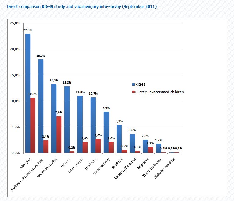 I really like this beauty of a chart as well which compares the the rates of various maladies of vaccinated children in a study in Germany and compares it to the results from a self-reported survey on an anti-vaccine website. Real impressive "science" there: