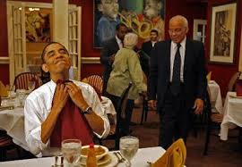 The most reliable way to protect your clothes at the dinner/restaurant table is the old way – by tacking it behind your shirt collar. This way it catches all of the splatter and prevents Vietnamese red hot sauce spots on your tie. It's logical and practical. It's OK when Obama does it. But people do look at me strange when I do this.