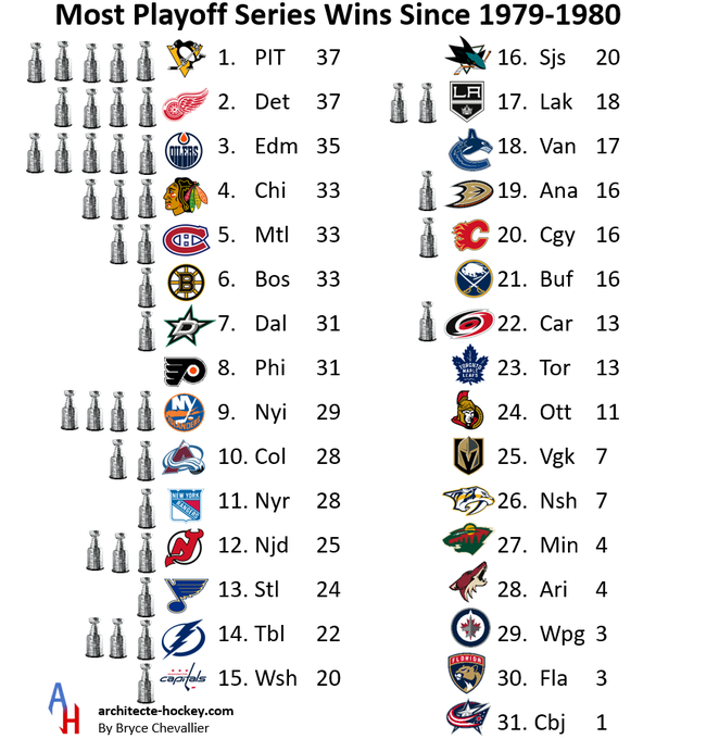 San Jose has the most series wins since 2005 with no championship to show for it. Vegas has the 5th most series wins since 2005 out of 21 teams that have not won the Cup. The team has only existed since 2017.