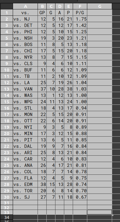 I would pay $$$ to watch Johnny vs NJD, PHI and NYR all season long. His top three teams to light up.