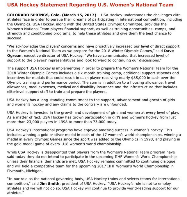 I like the part about how USA Hockey bragged about winning a medal in all 17 world championships in a tournament with absolutely no competition... as if that mattered to a financial dispute.