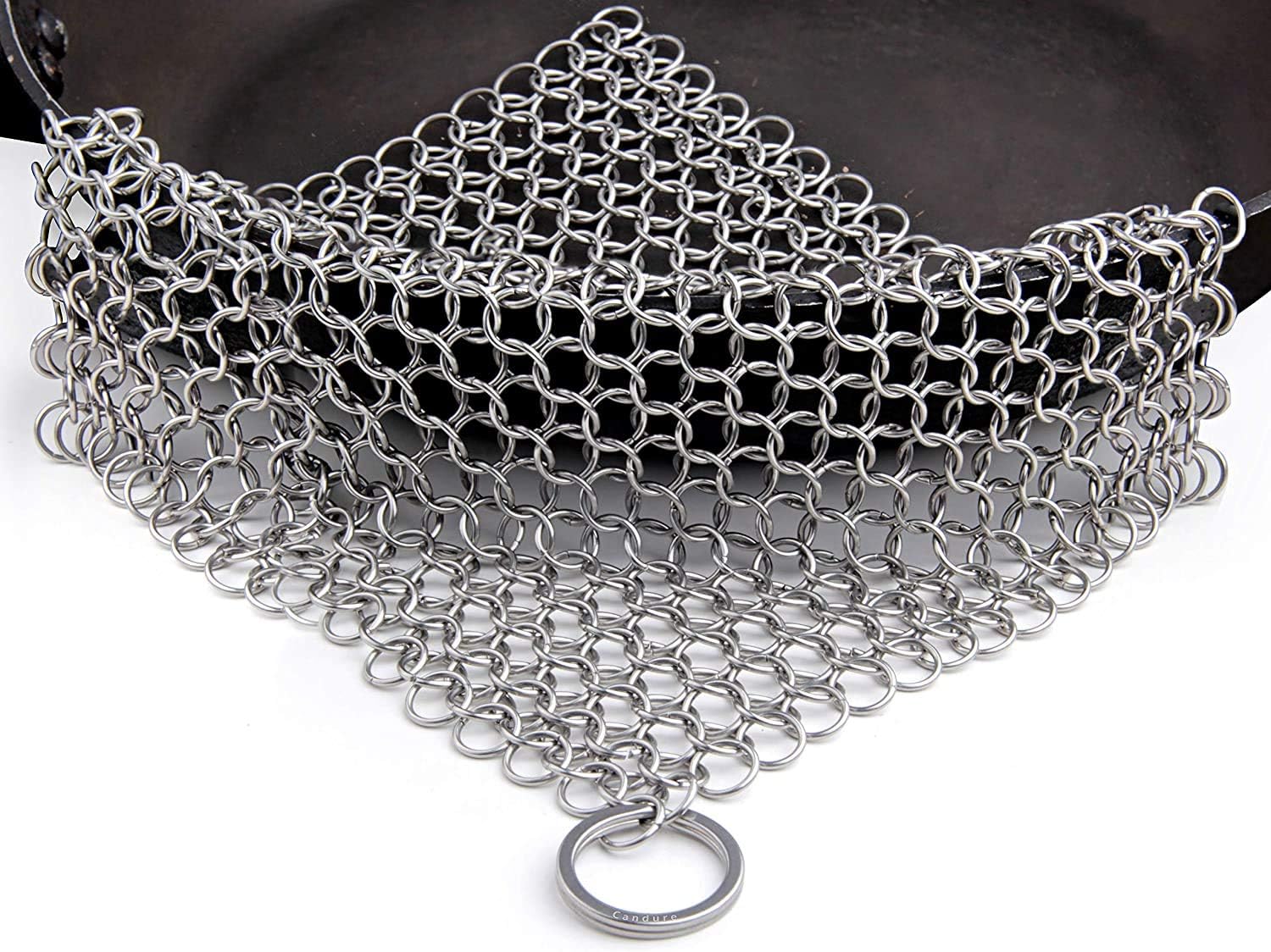 Some people like chain mail scrubbers to clean their cast iron as it leaves the seasoning intact.