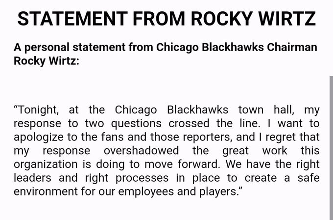 Cringe worthy but a start. He needs to invite the reporters back and give them, the fans of the Blackhawks, nhl, and most importantly the victims the decency of an answer to those important and fair questions. That was embarrassing to watch and I can’t help but think he’s learned nothing through all of this process and here’s hoping this bizarre response is finally a start for him to realize just how serious and damaging this has been on multiple levels and for multiple people.