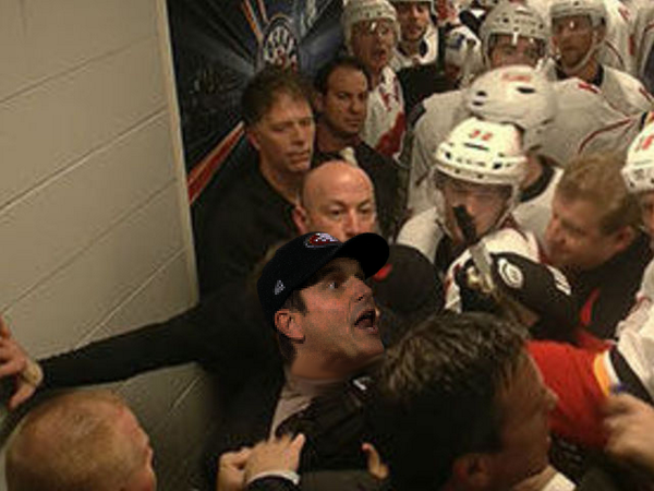 @TheStanchion: Apparently Harbaugh is still upset at the refs and for some reason he's trying to get into the Flames locker room.
