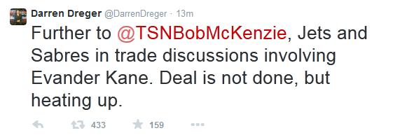 Boomer mentioning on theFan 960 that Winnipeg in 'heated' trade talks with Buffalo in regards to Evander Kane.